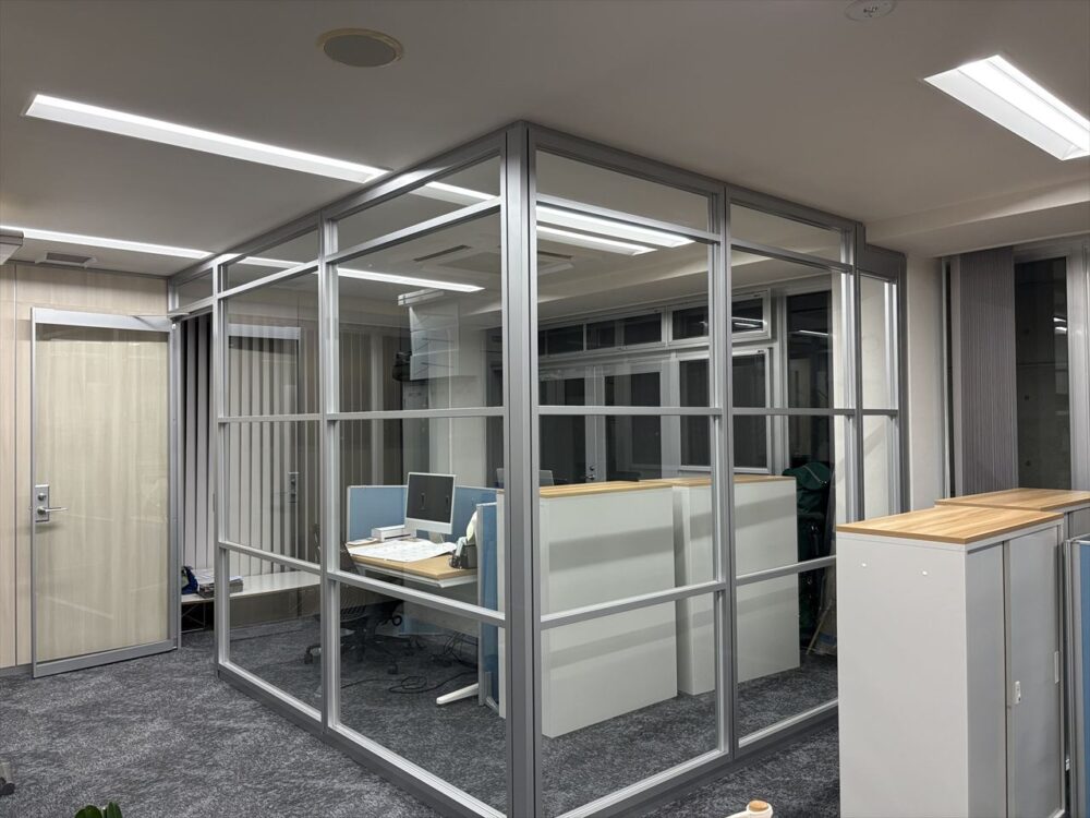 スタイリッシュなガラス間仕切りが設置されました。光はそのままに、独立した空間ができています。