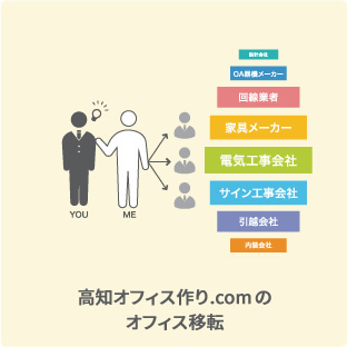 高知オフィス作り.comでは、信頼できる業者の選定や業者との打ち合わせを代行しています。当社がオフィス作りの一括窓口となることでお客様の負担を軽減することが可能です。また、オフィス作りの経験豊富なスタッフが一括窓口を代行するので、オフィス作りのスムーズな進行が可能です。